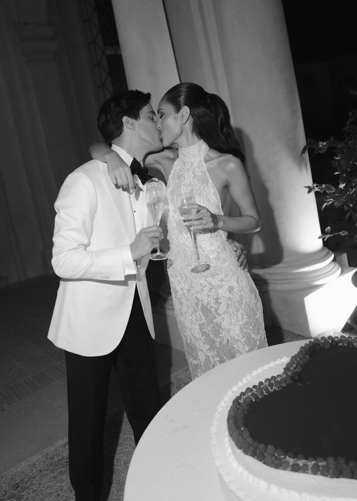 Set against the backdrop of the iconic Hotel Locarno Roma — one of Rome’s oldest hotels and a former favourite of Federico Fellini — the pre-wedding welcome party saw Josh don his double-breasted suit. Paired with one of our black pique polo shirts and matching black shoes from Maison Margiela (a gift from Cat), it was a decidedly daring look befitting of the eternal city glitterati hosted by the hotel in its heyday.