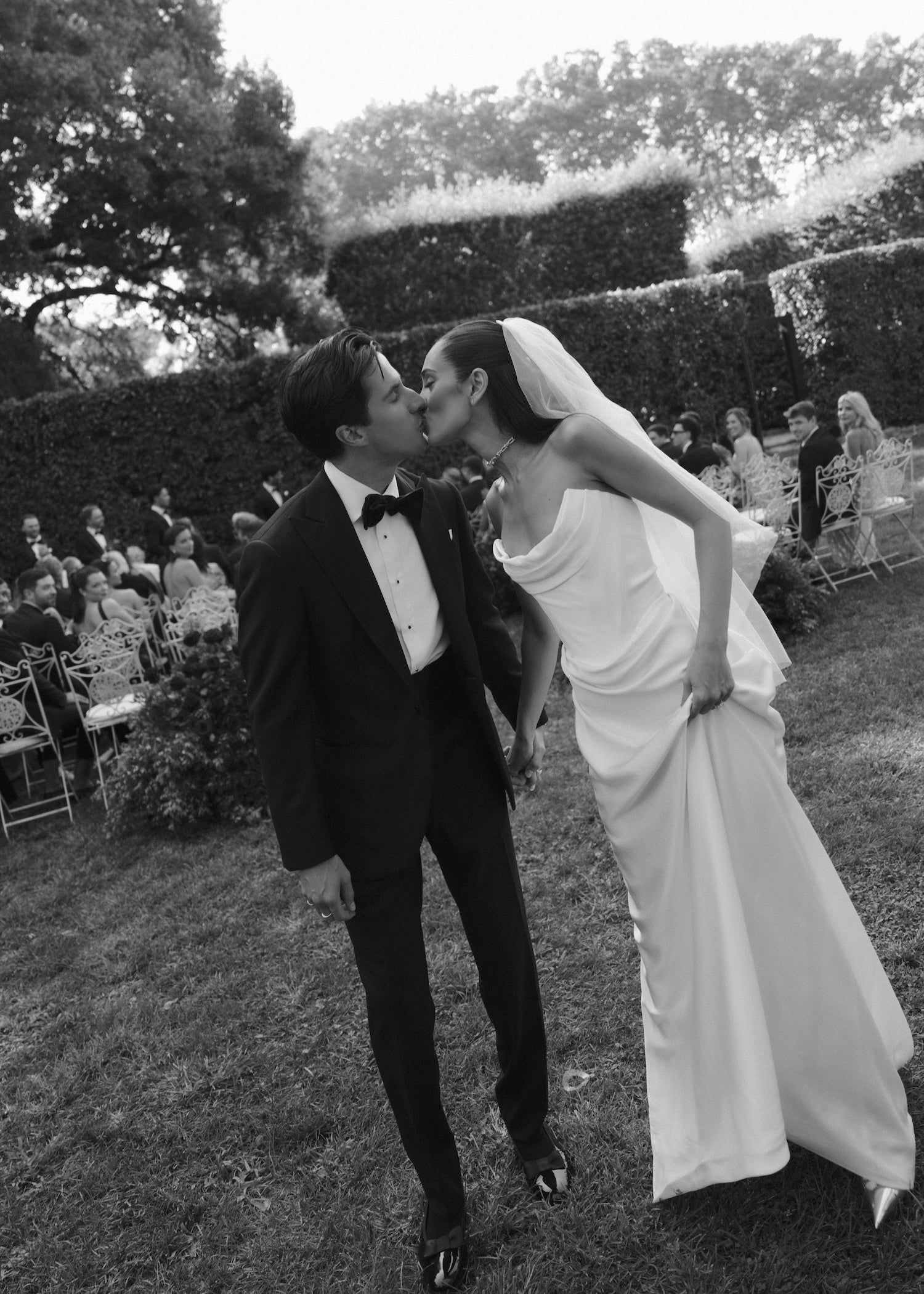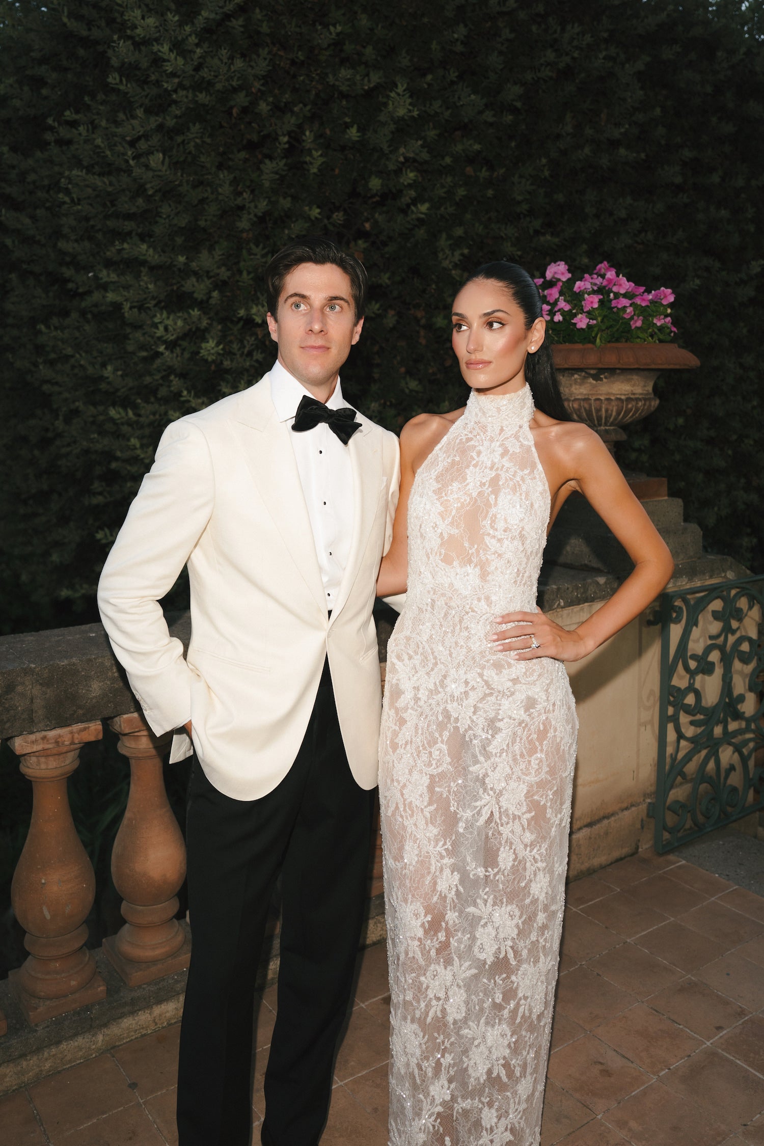 With sprawling gardens replete with Roman pine trees and palms, and winding walkways leading to breathtaking vistas of the city beyond, Villa Aurelia is a baroque beauty that perfectly underscores the adjective so often associated with Rome: eternal. And so, it was only appropriate that Josh’s ceremony suit — a classic black tuxedo with satin silk lapels and matching stripe on the trouser seam — was also eternally elegant.