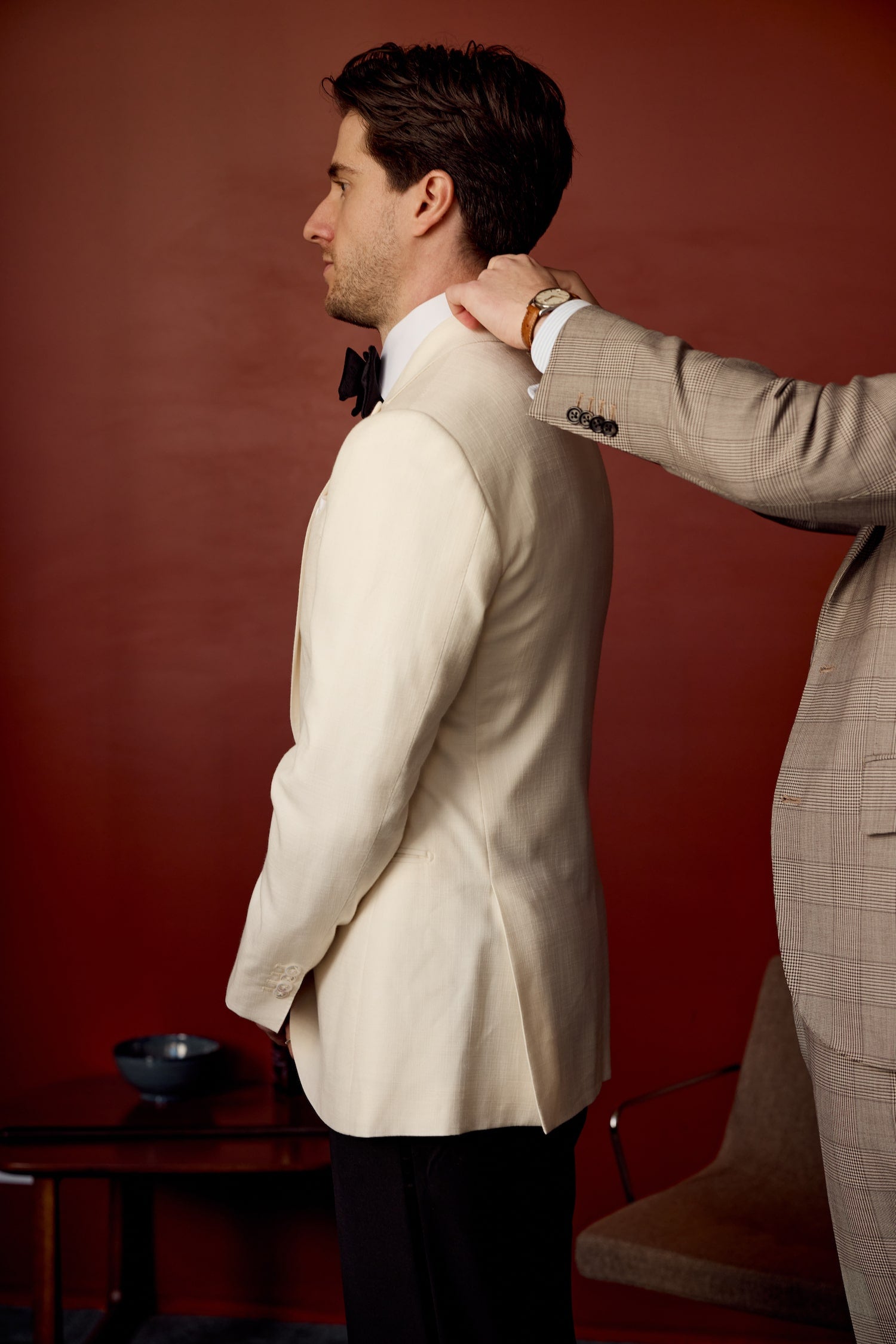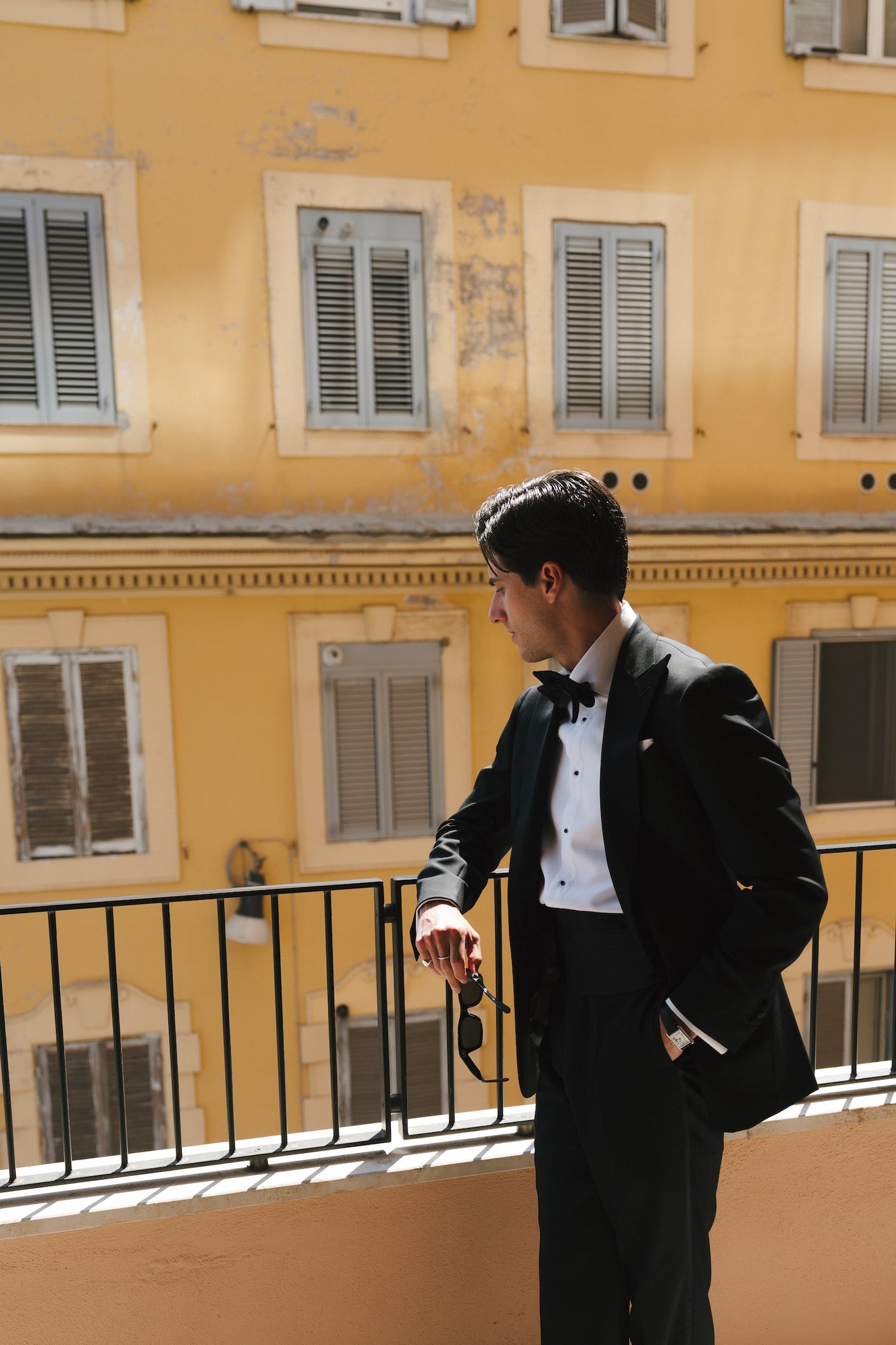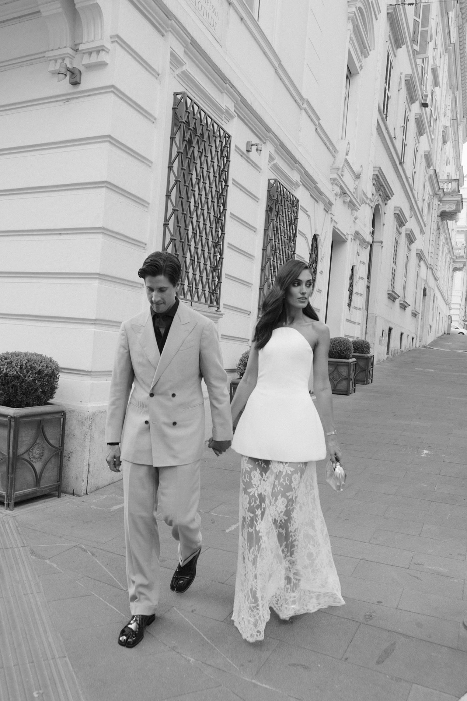 When working with grooms and couples on their wedding attire, we always want to anchor an outfit in its surroundings and style of the ceremony. Within Josh and Cat's wedding, there were three distinctive occasions: the pre-wedding welcome party, ceremony, and reception. And so, with their vision at the forefront, we set about curating one look for each occasion — each honouring a particular piece of Rome's storied past, while remaining firmly rooted in the present.