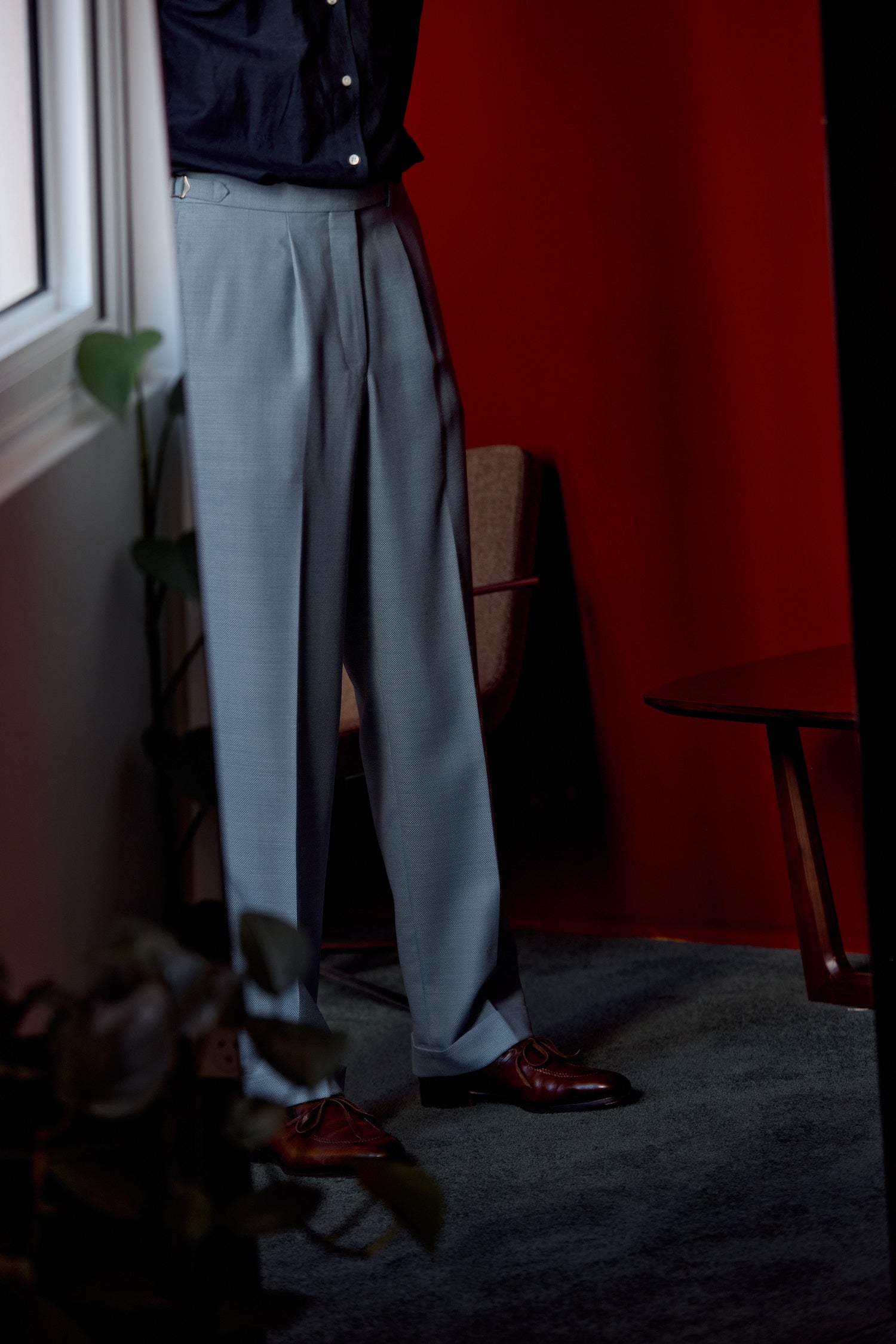 Trousers: Deep single pleat, side adjusters and turn-up cuffs
